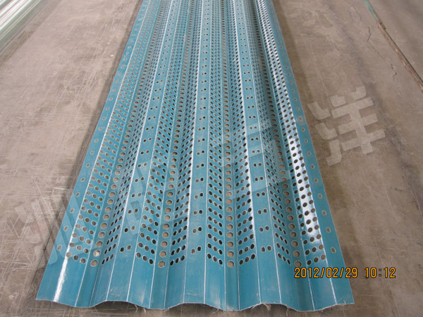 “擋風抑塵板”是采用新型FRP復合材料,利用空氣動力原理,加工成的一定幾何形狀的擋風板,并組合成抑塵擋風墻,其原理是使流通的空氣(強風)在墻體內側形成上、下干擾的氣流以達到外側強風、內側弱風、外側小風、內側無風的效果,從而有效除低來流風的風速,改變一部分來流風通過抑塵擋風墻后的風向,大限度的損失來流風的動能,避免來流風的明顯渦流,減少風的湍流度而達到減少起塵的目的。來流風通過擋風抑塵板形成湍流旋渦氣流后,風速、風壓的衰減幅度與風速平方成正比,所以,風速越大,抑塵擋風墻的抑塵效率越高,達到控制抑塵的效果越佳。從而起到防止粉塵飛揚保護環境污染的作用。